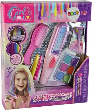 Le kit contient différents outils, dont un appareil spécial qui permet une application des couleurs sans souci sur les cheveux. Chaque pièce est pensée pour de petites mains et une grande imagination.
