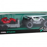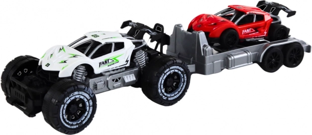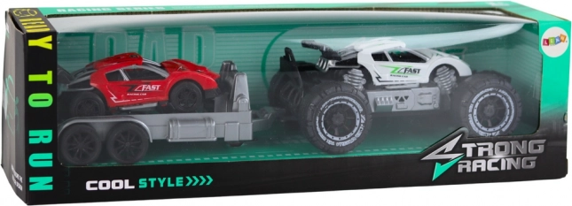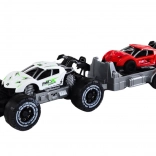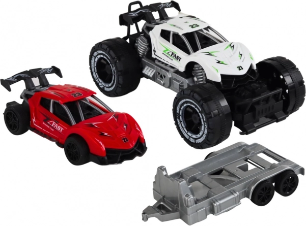 Voiture tout-terrain et voiture de sport rouge sur remorque constitue un excellent set de jouets pour les enfants qui aiment les aventures automobiles. Avec ses roues robustes et sa construction solide, il est prêt à relever tous les défis hors route.