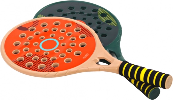 Set de 2 raquettes de padel pour le jeu sportif – padel – dans une élégante couleur verte et crème. Les raquettes sont fabriquées en plastique de haute qualité, solides et robustes. À la place d’un tamis cordé (comme sur une raquette de tennis traditionnelle), il s’agit d’un plastique perforé.