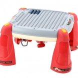 La table repose sur quatre pieds rouges amovibles, ce qui permet de jouer directement au sol. L’autre face de la table possède des plots pour empiler des briques et pour des jeux sensoriels.
