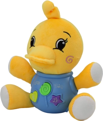 Sur le ventre du caneton se trouvent trois boutons colorés : un cœur pour les sons de la nature, le bouton central pour des comptines en anglais et une étoile pour les mélodies. Ils réagissent à une légère pression et encouragent les enfants à explorer.