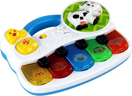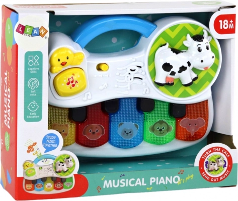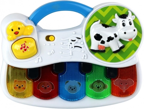 Découvrez le monde de la musique avec ce petit piano compact pour les tout-petits. Il propose 5 touches colorées avec des animaux, des effets lumineux et des sons qui stimulent les sens de l’enfant. En appuyant sur le bouton jaune, une mélodie joyeuse se déclenche, tandis que la vache rotative captive et amuse. Idéal pour développer la motricité fine, la perception auditive et l’imagination.