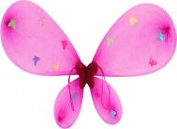 Grandes ailes roses avec motifs colorés de papillons et circuit lumineux. Structure légère et fixation par élastiques pour un port confortable.