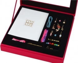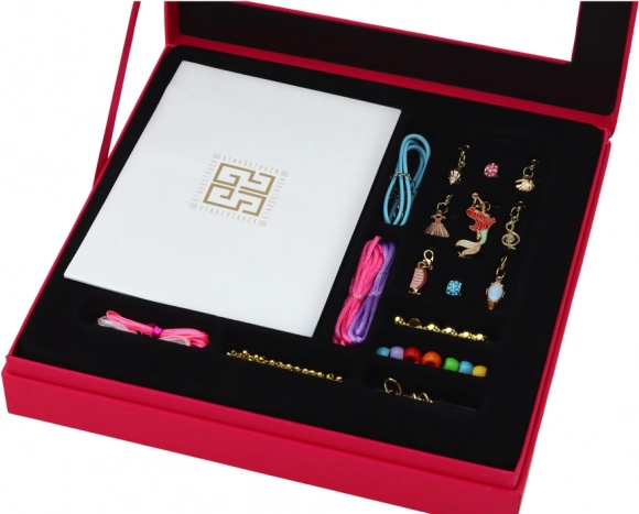 Il comprend des cordons, des fils de pêche et un collier pouvant aussi faire office de bracelet double – les possibilités sont vraiment nombreuses. Tout est rangé dans une élégante boîte, afin que les enfants puissent emporter le kit partout et garder chaque élément en ordre.