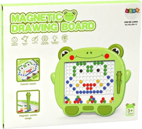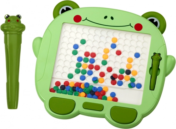 Au centre se trouve une grande surface blanche avec repères, idéale pour disposer les perles magnétiques. Avec ces perles disponibles en différentes couleurs — noir, bleu, jaune, rouge et vert — on peut créer divers motifs et images. Derrière la paroi transparente qui protège le dessin des dommages accidentels, les enfants peuvent arranger librement leurs compositions à l’aide d’un stylo magnétique spécial au motif de grenouille.