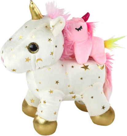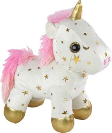 La licorne blanche avec étoiles dorées, crinière rose et sabots dorés est toute douce au toucher et invite aux câlins.