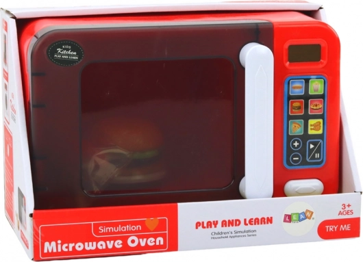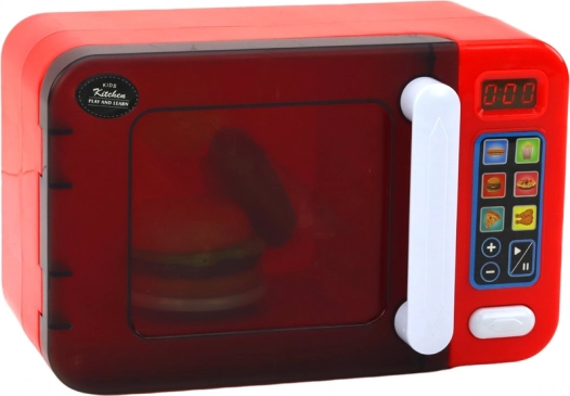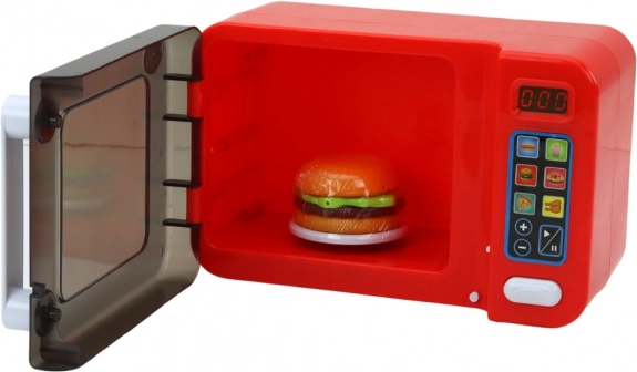 Un four à micro-ondes pour enfants interactif de couleur rouge transforme le jeu de cuisine en une expérience réaliste. Il offre des effets lumineux, un plateau tournant, une porte ouvrante et des programmes de chauffe. Inclus des accessoires – hamburger, frites et hot-dog. Amusement sécurisé pour les enfants dès 3 ans, alimenté par 3× AA (inclus dans la boîte).