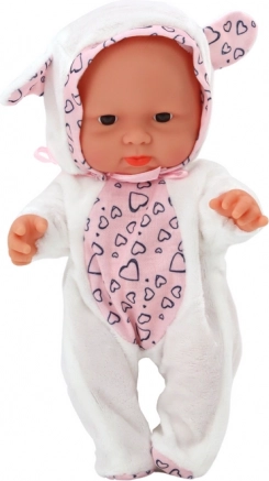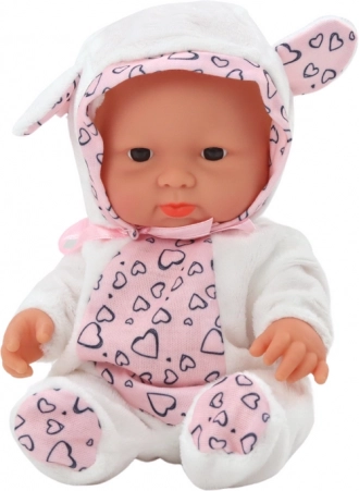La tenue blanche à motif de cœurs et la capuche à petites oreilles donnent à la poupée un look unique et délicat que les enfants adorent.