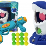 Le set est très simple à utiliser. Il suffit de charger le pistolet avec les balles souples et vous êtes prêt à tirer. Lorsque vous touchez la langue du requin, un son confirme l’impact et votre score s’affiche sur un petit écran LCD. La boîte contient tout le nécessaire pour démarrer la partie : un pistolet et des balles souples spéciales.