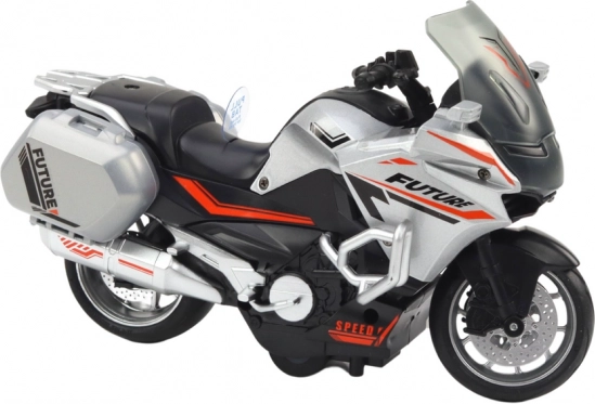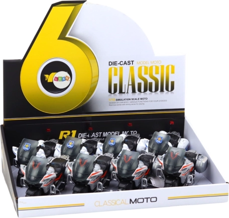 Disponible en deux variantes : police et sport. Veuillez choisir le modèle avant l’achat. Chaque jouet est emballé individuellement, mais le carton contient 8 pièces. Les dimensions de la moto sont 17 cm x 10,5 cm x 8 cm. Le jouet est certifié CE et conforme à la norme EN71. Convient aux enfants à partir de 3 ans.