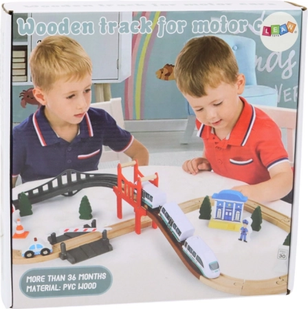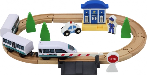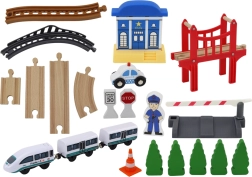 Ce circuit de train en bois de qualité ouvre aux enfants le monde des aventures ferroviaires. Grâce à son riche équipement – incluant pont, poste de police, barrières, panneau STOP et figurine de policier – ils peuvent créer leurs propres histoires et développer leur créativité. Des rails en bois stables permettent de construire différents circuits d’une longueur totale allant jusqu’à 3,2 m.