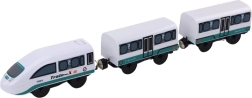 Le train se compose d’une locomotive et de deux wagons facilement connectables. L’alimentation est assurée par une pile 1,5 V AA (non fournie). Le jeu est sûr et éprouvé – le produit est certifié CE et conforme à la norme EN71, recommandé à partir de 3 ans.
