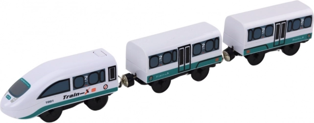 La rame Train-X avec wagons connectables assure une circulation fluide sur les rails en bois. Alimentation par 1× AA (non incluse).