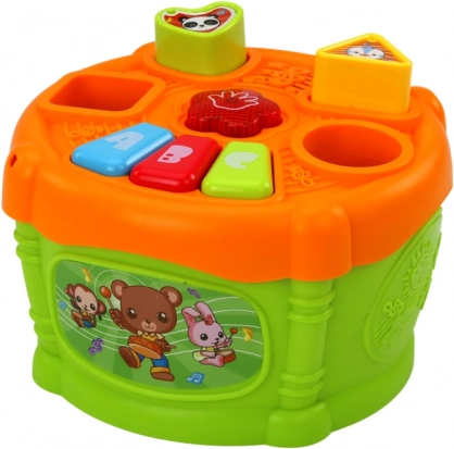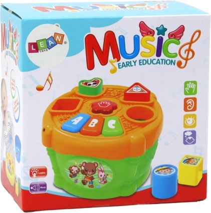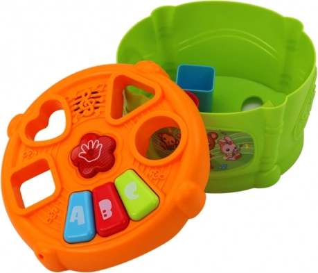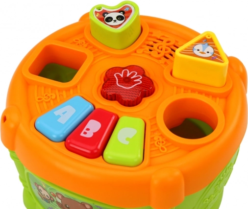 Jouet interactif pour enfants en forme de tambour au design coloré, combinant amusement et apprentissage. Il est équipé d’ouvertures pour différentes formes géométriques et de boutons marqués « A », « B » et « C », aidant les enfants à apprendre les formes et les lettres.