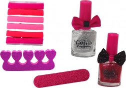 Le set comprend également un kit de décoration des ongles avec une lime, un séparateur et deux vernis pailletés en argenté et rose. La créativité manucure à portée de main !