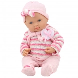 Le pull rayé rose et blanc avec petit nœud, le bonnet assorti et l’écharpe donnent à la poupée une allure charmante et encouragent un jeu imaginatif.