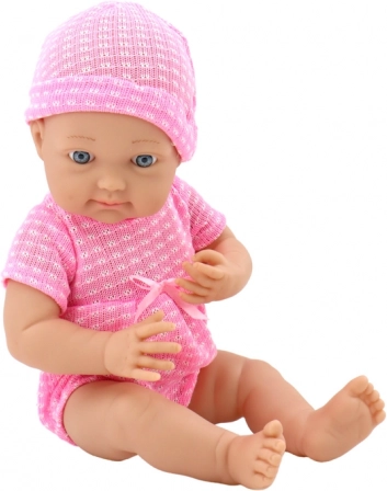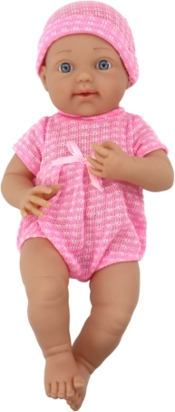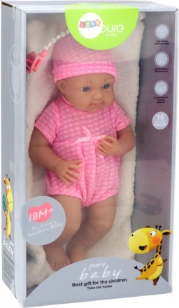 Ensemble textile rose avec bonnet, traits réalistes et yeux bleus qui ajoutent du charme à la poupée. La tétine pratique sur cordon ne se perd pas et enrichit les scénarios de jeu de soins.