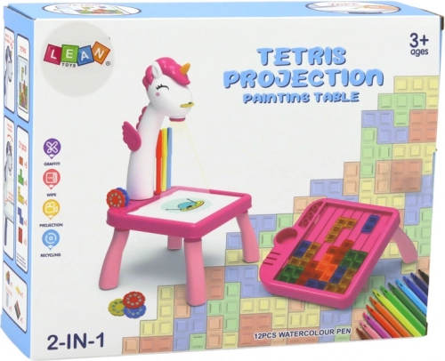 Découvrez la magie du dessin avec un mini projecteur en forme de licorne adorable. Les enfants projettent simplement un modèle sur la surface de la table et le repassent au feutre – ils développent ainsi rapidement leur perception visuelle, leur patience et leur habileté. La seconde partie du set est un puzzle TETRIS, qui entraîne la représentation spatiale et la planification.