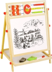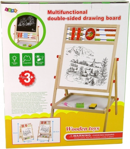.Le tableau de dessin éducatif double face avec boulier, horloge et alphabet est un outil de développement exceptionnel pour les plus petits. Fabriqué en bois massif, il garantit durabilité et sécurité pendant le jeu. Sa construction pivotante permet d’utiliser deux surfaces différentes : l’une revêtue d’un matériau noir, idéale pour dessiner à la craie, et l’autre, blanche, parfaite pour les feutres.