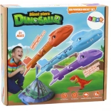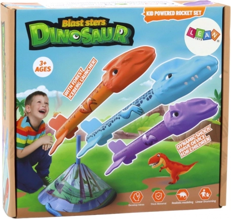 L'ensemble comprend trois fusées en forme de dinosaures de différentes couleurs (orange, bleu, violet), assurant un jeu coloré.