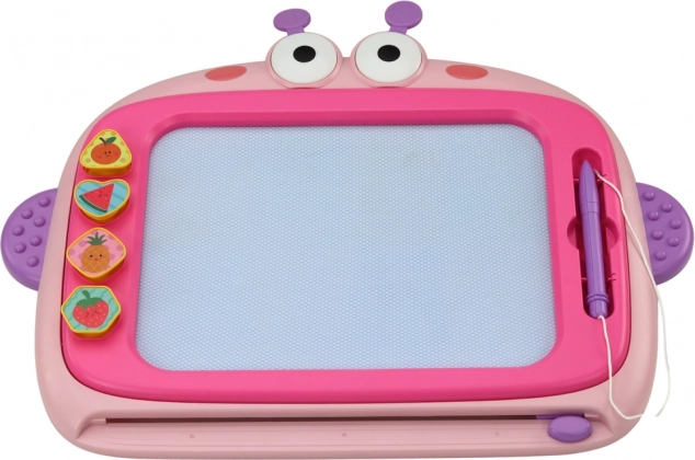 Tablette à dessin magnétique rose avec effacement, 4 couleurs et 4 tampons. Grande surface, poignée, pieds rabattables. Certifications CE, EN71. Pour enfants dès 3 ans.