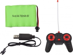 La manette à deux joysticks assure une direction fluide, l’accélération et le freinage. La boîte inclut également une batterie 6 V et un chargeur USB.