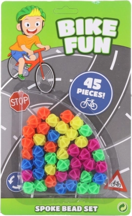 Perles décoratives colorées pour vélo. Matériau : plastique. L’emballage contient 45 perles. Après installation, elles montent et descendent selon le mouvement de la roue. Ce produit n’est pas un jouet.