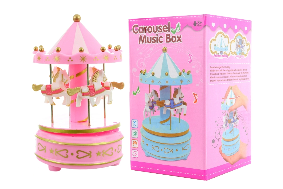 Manège musical. En tournant le manège, une mélodie se joue et il tourne. Dimensions env. 11 × 11 × 18 cm. Emballé dans une boîte. Sans piles, fonctionnement manuel. Âge 3+.