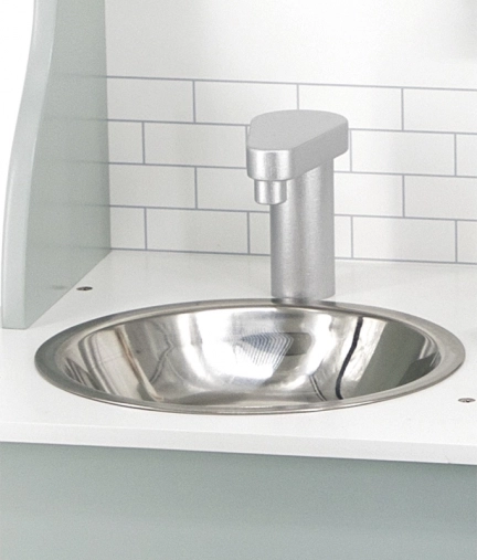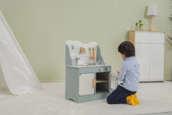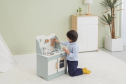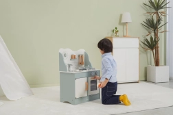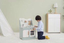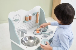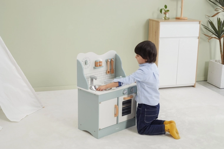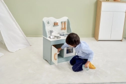 Après la cuisson, les enfants peuvent laver la vaisselle dans l’évier et ranger les aliments dans le placard de rangement sous l’évier. La cuisine pour enfants est fabriquée en bois peint et colorée avec des peintures non toxiques dans des tons « polaires ». Elle favorise la responsabilité et l’organisation pendant le jeu.