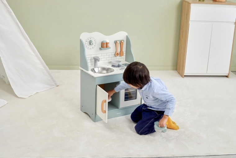 La cuisine en bois pour enfants est équipée d’un évier, d’un four et d’une cuisinière pour une cuisine authentique.