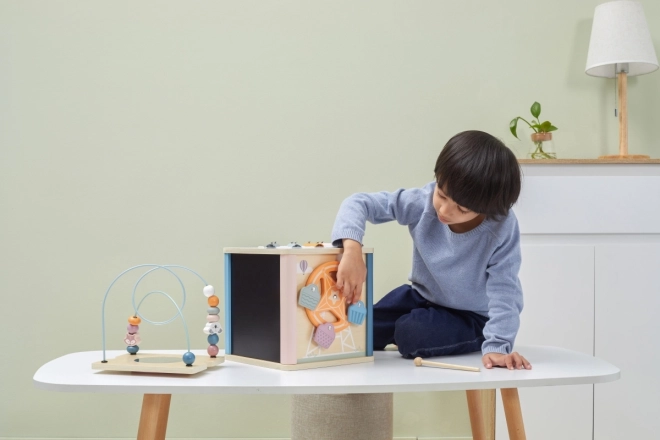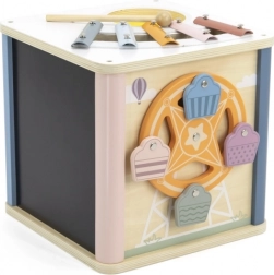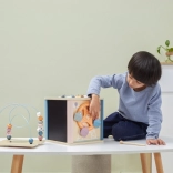 Comprend un trieur de formes, un labyrinthe à perles, un miroir, un xylophone, un tableau à craie et plus encore.