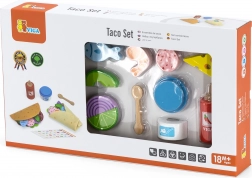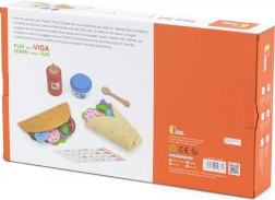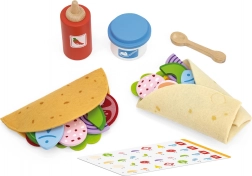 Le set tacos et burritos VIGA offre aux enfants une expérience de cuisine authentique. Les tortillas en feutrine souples et les aliments en bois colorés (légumes, fromage, poisson, etc.) encouragent à mélanger les saveurs et à créer ses propres recettes. Grâce aux accessoires comme la bouteille de sauce, le bol de « yaourt » et la cuillère en bois, le jeu est encore plus varié.