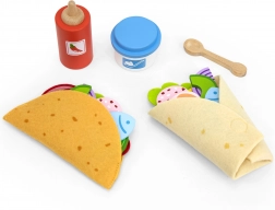 Tortillas, sauce, « yaourt » et plus de vingt ingrédients en bois colorés (p. ex. avocat, oignon, fromage ou poisson) permettent aux enfants de créer leurs tacos et burritos toujours différemment.