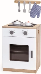 Offrez aux enfants leur propre coin cuisine pour imiter la préparation des repas comme les grands. Cette cuisinière en bois de qualité propose deux plaques, des boutons de commande rotatifs et un four avec porte transparente pour un jeu encore plus réaliste. Au-dessus de la table de cuisson se trouve une barre pratique pour suspendre les ustensiles et la manique.