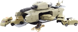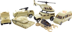 Ensemble militaire avec un grand char, 6 petites voitures et 1 hélicoptère. Matière plastique. Emballé en boîte. Dimensions de l’emballage env. 46 × 23,5 × 11 cm. Âge 3+.