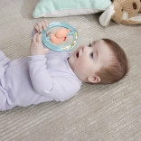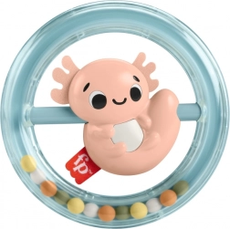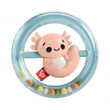 Un axolotl rotatif dans un anneau transparent avec des perles qui claquent, pour une stimulation visuelle et auditive.