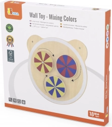 Trois roues faciles à tourner, dans des couleurs primaires, créent des motifs captivants en rotation. Les enfants apprennent à reconnaître les couleurs et à percevoir le mouvement et le rythme de façon ludique.