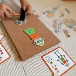 - Set complet : 45 pièces, planche en liège, marteau, punaises, cartes modèles.
