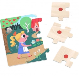 Découvrez un coffret magique de quatre puzzles en bois inspirés du conte de Raiponce. Chaque puzzle comporte 9 pièces et est rangé dans une boîte en bois pratique avec poignée en coton. Développe la motricité fine, la pensée logique et la narration. Des points colorés au dos des pièces facilitent le tri, et les magnifiques illustrations d’Ingela P. Arrhenius captiveront les enfants au premier regard.