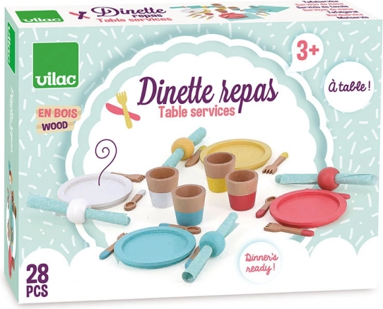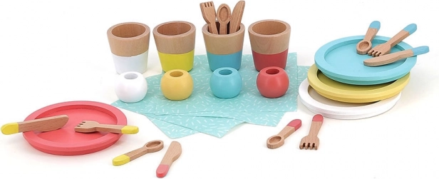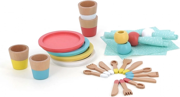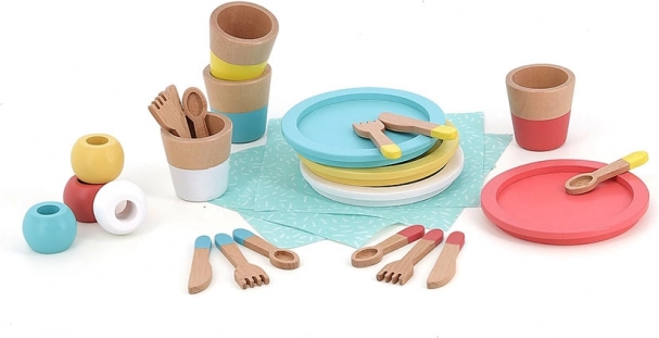 Ce set de vaisselle en bois offre aux enfants une expérience authentique de cuisine à la maison. Les assiettes, gobelets, cuillères, fourchettes et couteaux colorés, ainsi que les serviettes et leurs anneaux, inspirent le jeu d’imitation, développent la motricité fine et encouragent la coopération et la communication entre les enfants.