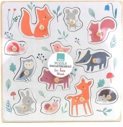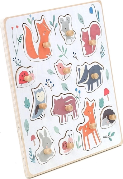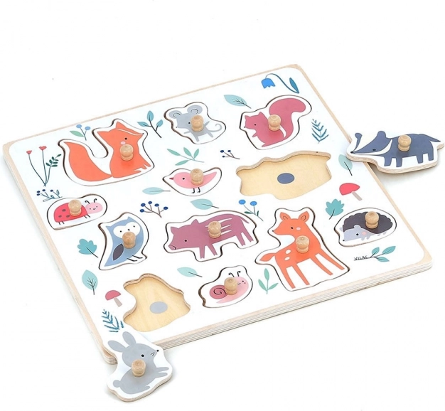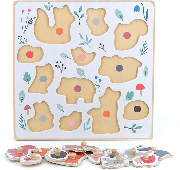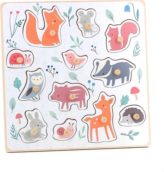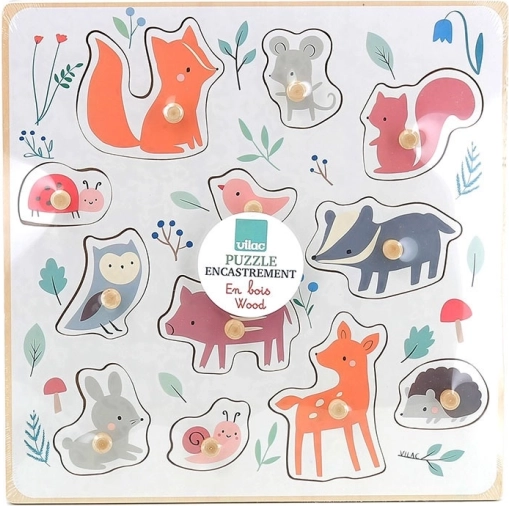 Renard, souris, écureuil, coccinelle, oiseau, blaireau, chouette, petit cochon, lapin, escargot, chevreuil et hérisson – idéal pour élargir le vocabulaire et reconnaître formes et couleurs.