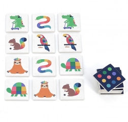 Entrez dans un monde arc-en-ciel peuplé de baleines, d’écureuils et de flamants roses. Ce mémo se distingue par sa fabrication en bois de qualité et ses illustrations marquées qui captivent instantanément les enfants. Le jeu favorise naturellement le travail de la mémoire, enrichit le vocabulaire et renforce la concentration ainsi que la perception des détails.