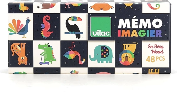 Découvrez la magie d’un monde haut en couleurs avec le mémo en bois de Vilac. Vous y trouverez 48 pièces illustrées d’adorables animaux signés Andy Westface, qui développent la mémoire, l’attention et le vocabulaire des enfants dès 2 ans. Les pièces sont agréablement grandes, robustes et faciles à saisir même pour les petites mains.