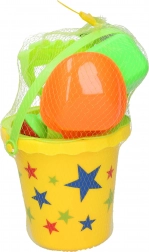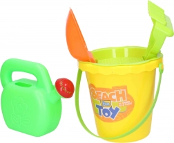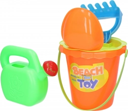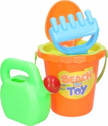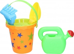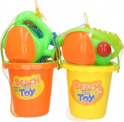 Le set contient tout le nécessaire pour construire des châteaux, faire des moules et arroser : seau, tamis, arrosoir, râteau et pelle. Deux couleurs vives au choix – jaune et orange – pour aider les enfants à reconnaître facilement leur propre set.