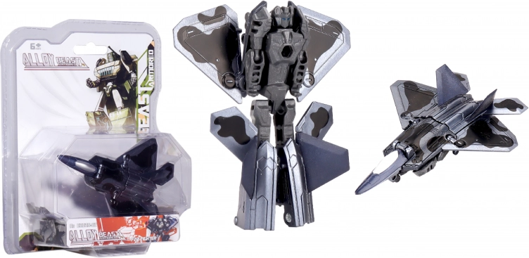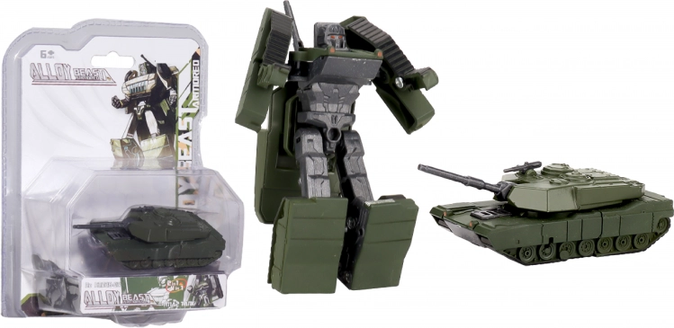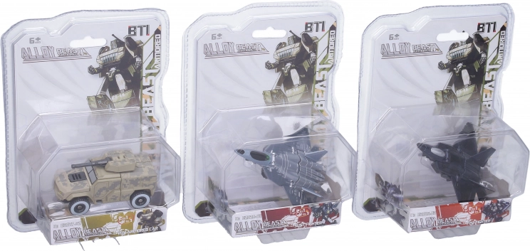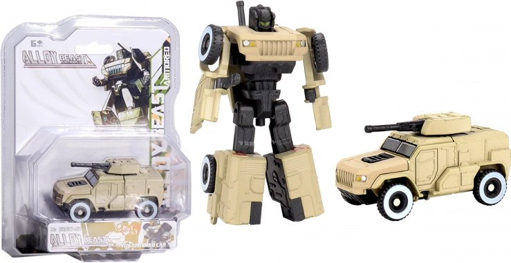 Autorobot en métal 11 cm en 4 variantes : chasseur clair, chasseur foncé, char et véhicule militaire. Jouet métallique robuste, idéal pour les jeux d’action et les collectionneurs.
