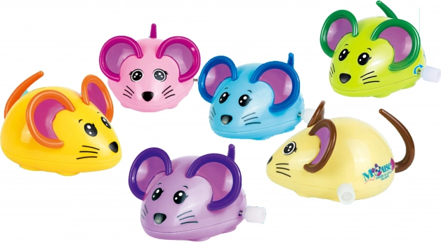 Souris en plastique à remonter, 8 cm, en six couleurs. Jouet idéal pour les enfants. Vendue par 12 pièces.