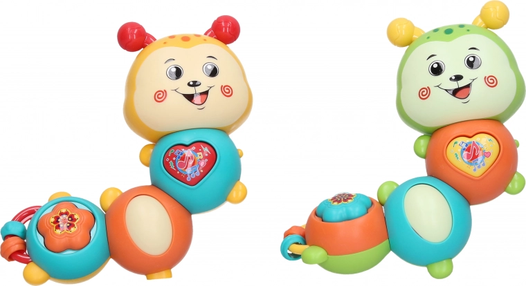 Un hochet attrayant en forme de chenille de 14 cm offre des effets lumineux et sonores, y compris des mélodies qui captiveront chaque enfant.