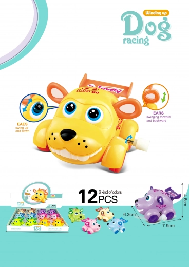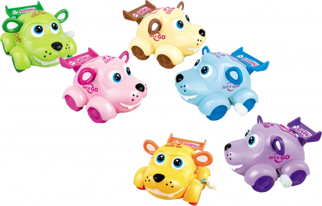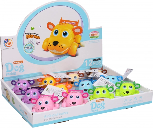 Chien à remonter en plastique 8 cm, 6 couleurs. Excellent jouet pour enfants. Emballage de 12 pcs.