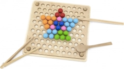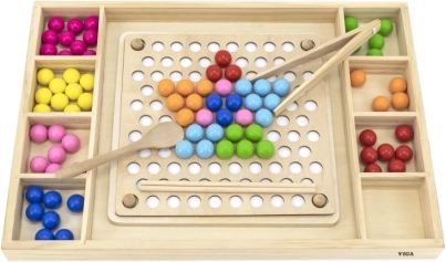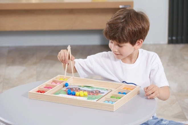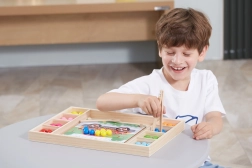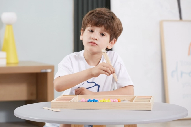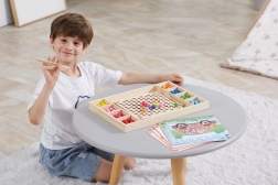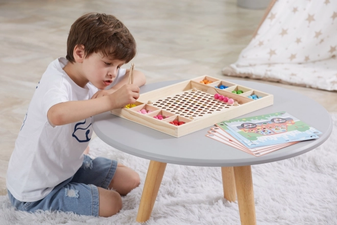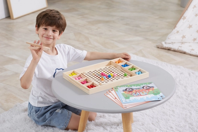 Le jeu éducatif en bois « Attrape et Range » permet aux enfants d’essayer différents motifs et couleurs selon les fiches incluses ou leur propre imagination. Avec ce jeu, les enfants peuvent fixer une fiche sur le plateau en bois et, à l’aide de baguettes, d’une cuillère ou d’une pince, déposer des billes colorées dans les trous de la planche. À la fin, ils peuvent créer de belles images.