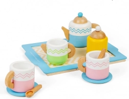 Ce riche service à thé offre tout le nécessaire pour de petits hôtes – des tasses jusqu’à la théière et au plateau. La fabrication en bois de qualité, les finitions lisses et les délicates couleurs pastel invitent au jeu, qui développe l’imagination, la communication et les règles de base de la table.